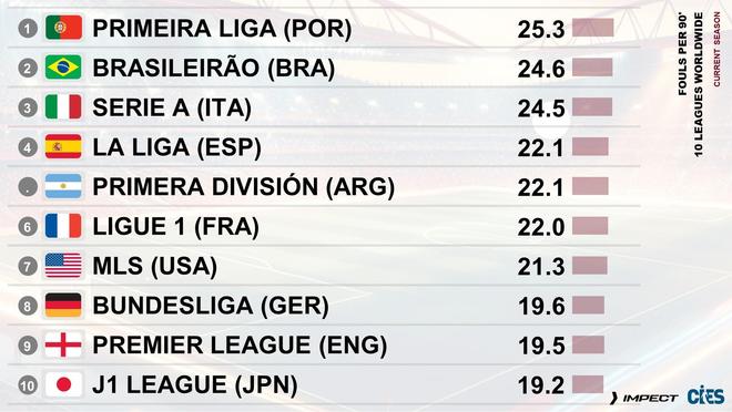 各联赛每90分钟犯规次数榜:葡超25.3次居首、意甲24.5次第三